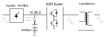 早期大中型UPS主回路結(jié)構(gòu)采用可控硅整流將輸入的交流電整為直流,電池直接掛在直流母線上,當(dāng)輸入市電正常時(shí),靠整流可控硅的調(diào)節(jié)對電池充電,同時(shí)為GTR或IGBT結(jié)構(gòu)的橋式逆變器供電,逆變器將直流逆變?yōu)榻涣,最后?jīng)過輸出變壓器的升壓及濾波,提供純正的交流輸出。從其結(jié)構(gòu)中可以看出,從整流(從交流變?yōu)橹绷鳎┑侥孀儯ㄔ趶闹绷髯優(yōu)榻涣鳎┑倪^程中,每個(gè)環(huán)節(jié)都是將壓環(huán)節(jié):可控硅整流是為了提供恒定的直流電壓而采取的一種整流方式(可通過可控整流的導(dǎo)通角調(diào)整來適應(yīng)輸入電壓變化,確保輸入交流電壓變化時(shí)整流輸出直流電壓的恒定),由于可控硅整流只能斬掉一部分輸入電,所以其恒定輸出電壓的代價(jià)是將輸出電壓恒定在底于全波整流輸出電壓的某個(gè)數(shù)值上。而逆變環(huán)節(jié)同樣是一個(gè)降壓環(huán)節(jié),從可控整流輸入來的直流電在通過逆變器逆變出交流的過程中同樣采用的是斬波的做法,其結(jié)果同樣是輸出電壓等級的再次降低。正是由于上述的原因,在此種結(jié)構(gòu)的UPS中,必須在輸出測加入升壓變壓器,將逆變輸出的較低恒定電壓升致合理的輸出范圍,最終提供了恒定的220/380V輸出。
